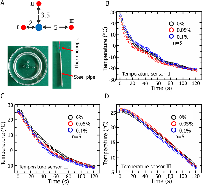 Figure 6 illustrates the temperature changes during cryosurgery at three points. Thermocouple was inserted into a steel pipe (Figure 6A) to ensure that the temperature of the same point is measured for each experiment. Figure 6B, 6C, and 6D shown the temperatures for all points measured.