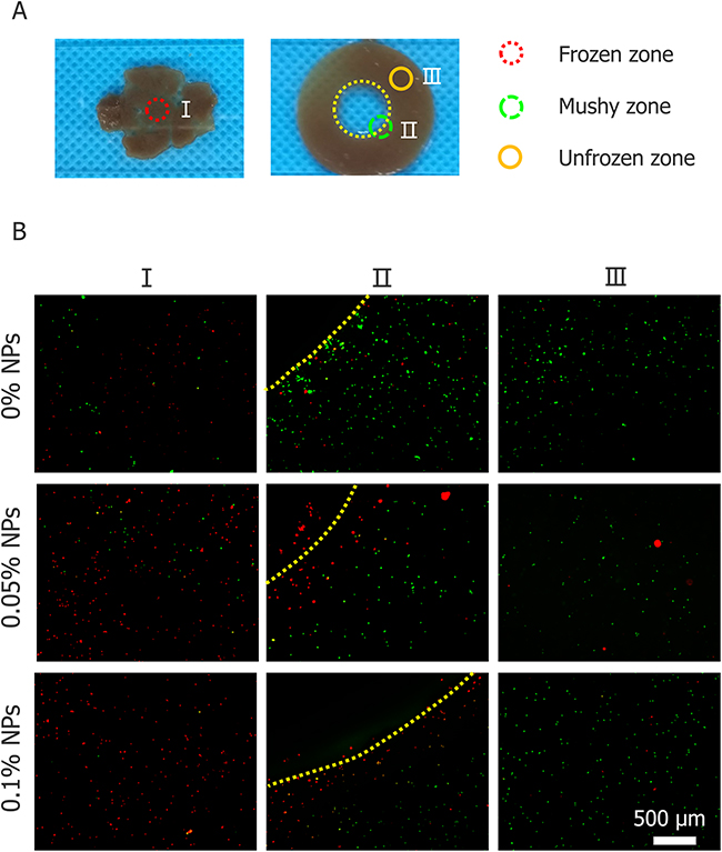 Figure 7: Cell viability of three regions of tumor model. (A) Illustration of three regions. (B) Cell viability test for three regions treated with 0, 0.05 and 0.1% (w/v) nanoparticles (visualized with 4× Objective lens).