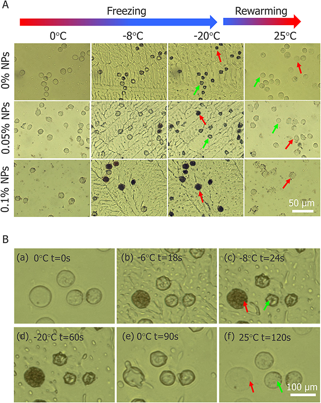 Figure 8: Images of HepG2 cells during freezing and thawing process in cryomicroscopic experiments. (A) Morphology of HepG2 cells with three different concentrations of Fe3O4 nanoparticles during cryomicroscopic experiments (visualized with 20× objective lens). (B) Two different fates of HepG2 cells without nanoparticles during cryomicroscopic experiments (visualized with 50× objective lens). Red arrow indicates cells with IIF and green arrow indicates cells without IIF.