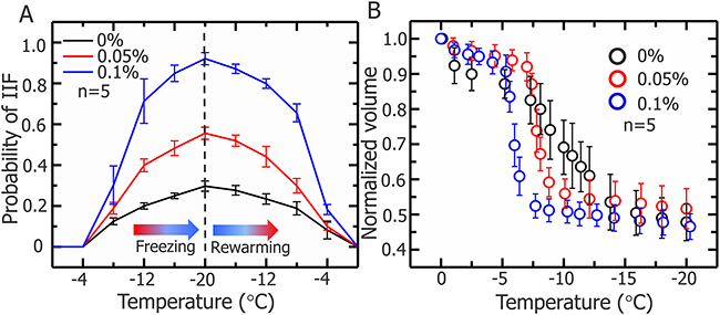 Figure 10: Probability of IIF in HepG2 cells and normalized cell volume during freezing process. (A) Probability of IIF during the freezing-rewarming process corresponding to cryosurgery, HepG2 cells treated with 0, 0.05, and 0.1% (w/v) Fe3O4 nanoparticles and freezing/rewarming was achieved at rate of 20 °C/min. Data are means ± SD (n=5). (B) Normalized volume of HepG2 cells treated with nanoparticles during freezing process. Data are means ± SD (n=5).