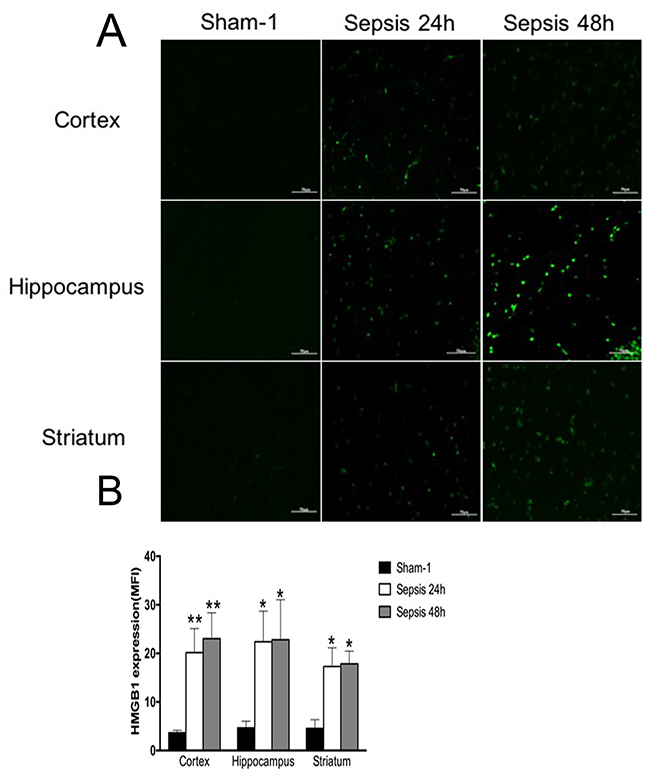 Figure 1: Expressions of HMGB1 in various brain regions measured by immunofluorescence staining. (A) Brain tissues of cortex, hippocampus, and striatum showed significantly enhanced expression of HMGB1 in the sepsis group compared with the sham group, as presented with green fluorescent (n=6). (B) Statistical results for immunofluorescence staining of HMGB1 expression (vs. the sham group: * P<0.05, ** P<0.01).