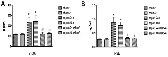 Serum S100β and NSE were common markers for brain injury in septic response [18, 19]. ELISA results exhibited higher levels of serum S100β and NSE in the sepsis group than those of the sham group (n=6, P<0.05, Figure 4). In the sepsis with BoxA treatment group, however, S100β and the NSE levels were both decreased in comparison to the sepsis group (n=6, P<0.05).