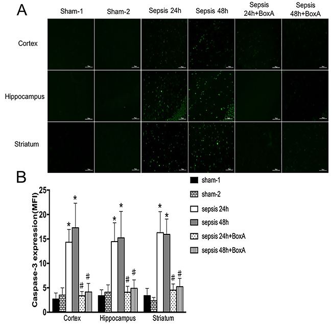 Figure 6: Expressions of caspase-3 in various brain regions measured by immunofluorescence staining (green). (A) In the sepsis group, expressions of caspase-3 in different brain regions were elevated in comparison to those in the sham group (n=6). Blockade of brain HMGB1 markedly lowered caspase-3 expressions when compared to those in the sepsis group (n=6). (B) Statistical results clearly showed the difference among these groups (vs. the sham-1 group: * P<0.05; vs. the sepsis group:#P<0.05).