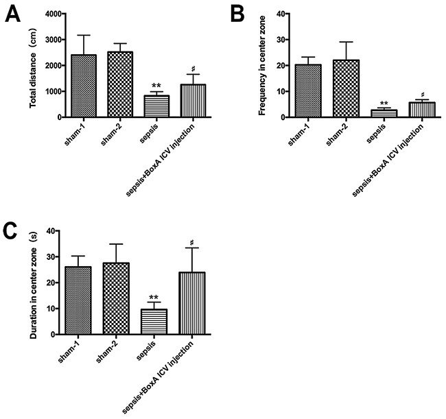 Figure 7: The open field test for measuring locomotor activity of mice in various groups. (A) Sepsis resulted in a significant decrease of total distance of mice in the open filed, while this effect was abated by antagonizing brain HMGB1(n=6). (B) Neutralizing cerebral HMGB1 obviously improved frequency in center zone of mice that greatly suppressed in the setting of sepsis (n=6). (C) The duration in center zone was presented with lower level in the sepsis group than that in the sham group, while improved by injecting BoxA into right lateral ventricle (n=6, vs. the sham-1 group: * P<0.05, ** P<0.01; vs. the sepsis group: #P<0.05).