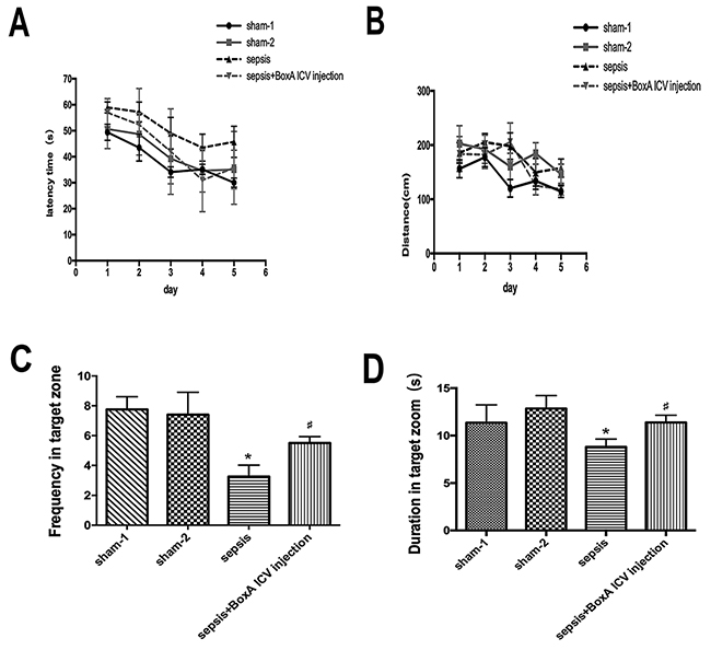 Figure 8: The impairment of memory and learning of mice determined by Morris water maze. (A) The latency time to escape was increased on days 3, 4 and 5 after septic challenge. Antagonizing brain HMGB1 abated the prolonged latency time of septic mice (n=6). (B) Blocking cerebral HMGB1 showed no significant difference in escaped distance among the four groups (n=6). (C) Sepsis induced a significant decrease of frequency in target zone compared with the sham group, while these effects were vanished by intracerebroventricular BoxA injecting (n=6). (D) Neutralizing brain HMGB1 also improved suppressed duration in target zone of septic mice (n=6, vs. the sham-1 group: * P<0.05, ** P<0.01; vs. the sepsis group: #P<0.05).