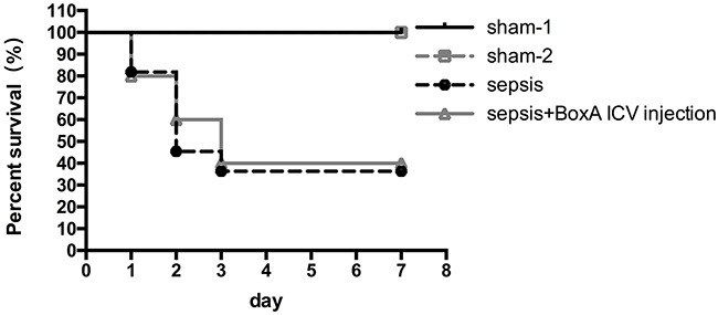 Mice were randomly divided into four groups: sham CLP group (sham-1), CLP group, sham ICV injection group (sham-2), CLP plus ICV injection group (BoxA, 1 μg). The CLP groups and the CLP plus BoxA groups were both further divided into two groups according to the sacrificed time points of 24 and 48 hours after CLP surgery (Sepsis 24h+BoxA, Sepsis 48h+BoxA). In order to inhibit brain HMGB1 directly, the injection of BoxA solution (0.25 μg/μl, with 4 μl saline solution) was conducted at 0, 24 and 48 hours after operation. A pre-assembled syringe needle was placed into the cannula in accordance with its length. Then, the syringe was removed at 5 minutes after injection. Mice of sham group were injected with 4 μl normal saline (sham-2). The survival rates of all groups were observed for 7 days after CLP surgery.