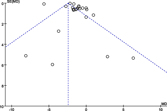 I2 statistics were used to measure heterogeneity of the RCTs. If the I2 value was less than 50%, a fixed-effects model was applied. If the I2 value was 50% or more, a subgroup analysis was conducted. Subgroup analyses for pain intensity primarily included different pain types and compared groups, while analyses for total analgesic consumption included the stage used and compared groups. If a significant heterogeneity could not be identified by subgroup analysis, a random-effects model meta-analysis was used [48]. Sensitivity analyses were conducted to examine the stability of the pooling outcome and to trace the heterogeneity source by excluding the sole study with low quality or high risk of bias. Publication bias was tested using a funnel plot (Figure 2) and Egger’s test [50, 51].