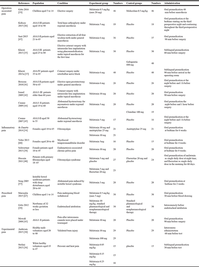 RCTs enrolled participants with any type of pain, including inflammatory pain, operation-associated pain, experimental pain and procedural pain. Melatonin could be administered orally or intravenously, either solely or in combination with other drugs. Both trials comparing melatonin with placebo or with positive control were included. Trial protocols without results, animal experiments, and studies without control groups were excluded.