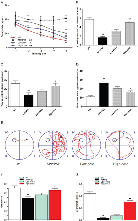 Figure 1: BJJS improved the learning and memory abilities in APP/PS1 mice. (A) Escape latencies in water maze during the positioning navigation test. (B) Crossing times of the platform location during the probe trial. (C, D) Time spent in the target quadrant and in the opposite quadrant during the probe trial. (E) Representative tracings of the animal’s path during the positioning navigation test. (F) The partial index on the third day of the novel object recognition test. (G) The discrimination index on the third day of the novel object recognition test. Data are shown as the mean ± SEM (n=10 mice per group). # P<0.05 and ## P<0.01 versus the wild-type group. * P<0.05 and ** P<0.01 versus the APP/PS1 group.