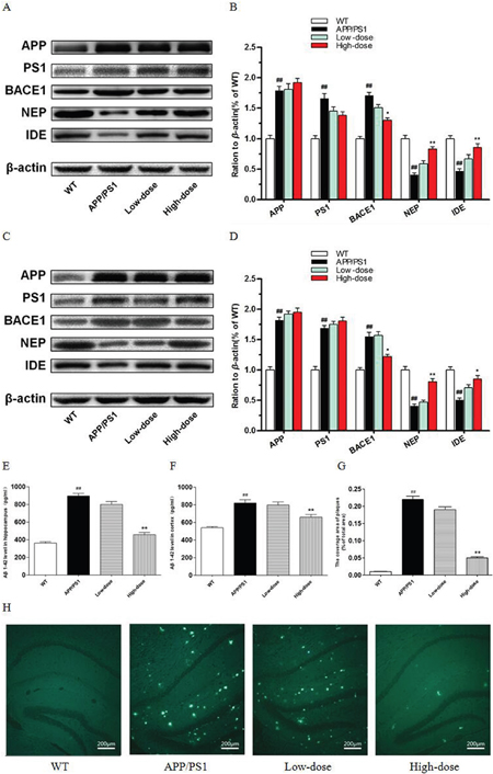 In addition, we also used Enzyme-linked immune sorbent assay to evaluate the level of Aβ1-42 both in hippocampus and cortex of the 4 experimental groups (Figure 2E, 2F). As expected, the APP/PS1 group presented a significantly higher level of Aβ1-42 compared with the wild-type group (P<0.01 vs. wild-type) (Figure 2E, 2F). Interestingly, we found that the high-dose BJJS significantly decreased the level of Aβ1-42 both in the hippocampus and cortex compared with the APP/PS1 group (P<0.01 vs. APP/PS1) (Figure 2E, 2F).