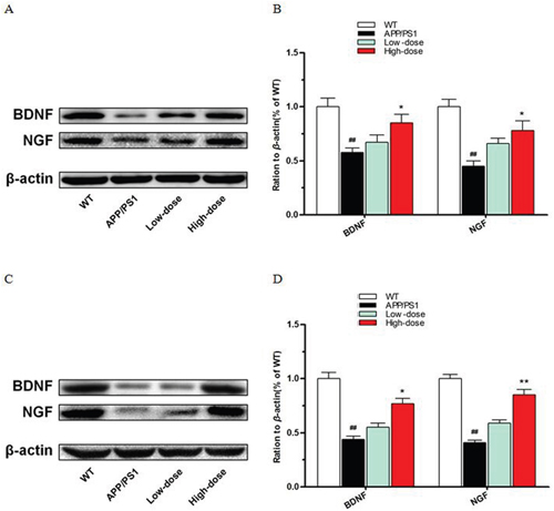 Figure 3: BJJS enhanced the expression level of neurotrophic factors in APP/PS1 mice. (A, B) The levels of BDNF and NGF in the hippocampus. (C, D) The levels of BDNF and NGF in the cortex. Data are shown as the mean ± SEM (n=10 mice per group). # P<0.05 and ## P<0.01 versus the wild-type group. * P<0.05 and ** P<0.01 versus the APP/PS1 group.