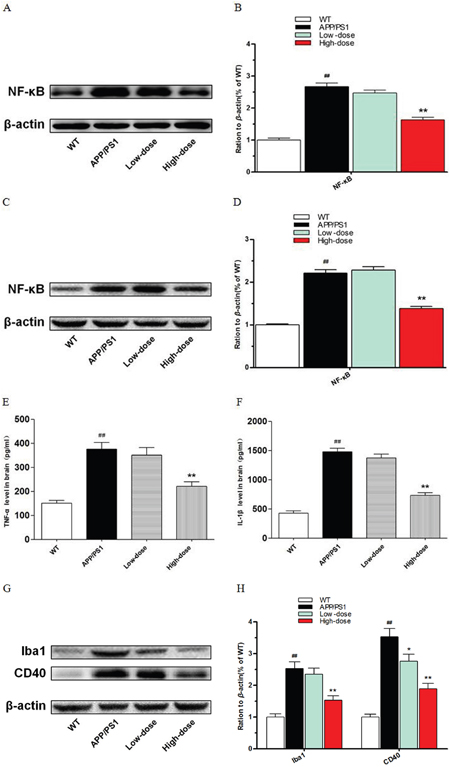 In this study, we found that BJJS had an inhibitory effect on neuroinflammationin APP/PS1 mice. We analyzed the levels of nuclear factor-kappa b (NF-κB), tumor necrosis factor-α (TNF-α), interleukin-1β (IL-1β) and the microglia markers Iba1, CD40 by western blot and ELISA (Figure 4).