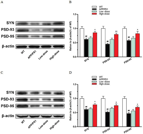 As a result, high-dose BJJS increased the levels of SYN (P<0.05 vs. APP/PS1) (Figure 5), PSD-93 (P<0.01 vs. APP/PS1) (Figure 5) and PSD-95 (P<0.05 vs. APP/PS1) (Figure 5) both in the hippocampus and cortex compared with the APP/PS1 group.