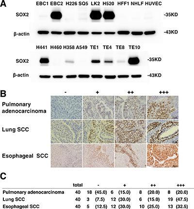 Figure 1: SOX2 expression in lung, esophageal SCC and pulmonary adenocarcinoma. (A) Immunoblot analysis of SOX2 in indicated cells. The expression level of β-actin is shown as a control. (B) The intensity of SOX2 staining was assigned the following scores: none = -, weak = +, moderate = ++, and strong = +++ expression. Examples of representative immunohistochemistry results are shown. Bars, 50 μm. (C) SOX2 expression in primary pulmonary adenocarcinoma samples of 40 patients, lung SCC samples of 40 patients and esophageal SCC samples of 40 patients who underwent surgical tumor resection at the Kawasaki Hospital Attached to Kawasaki Medical School between 2007 and 2012. Percentage values are given in parentheses.
