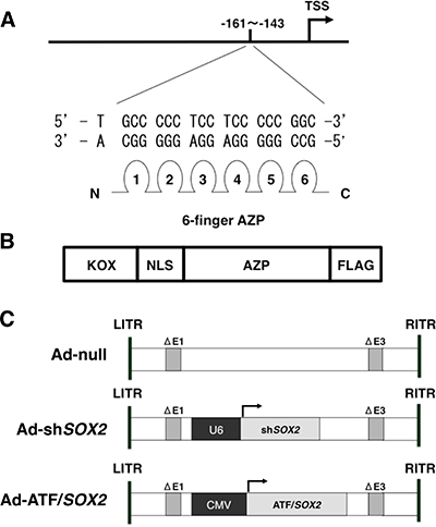 Figure 2: Schematic representation of ATF/SOX2. (A) Design of Artificial zinc finger protein (AZP) to target a 19 bp sequence (-161: TGCCCCCTCCTCCCCCGGC:-143) in human SOX2 distal promoter region. TSS; transcription start site. (B) The Artificial Transcription Factor (ATF) contains the KOX suppressor domain, a nuclear localization signal (NLS), the Artificial zinc finger protein (AZP) and a FLAG tag. We termed this ATF as ATF/SOX2. (C) Schematic representation of Ad-null, Ad-shSOX2 and Ad-ATF/SOX2. The PCR-generated expression cassette of ATF/SOX2 from pcDNA3.1 ATF/SOX2 or shSOX2 from pBAsi-mU6 shSOX2 (described in Materials and Methods section) were subcloned into the linearized E1 deleted adenovirus type 5 genome. E1; Adenovirus early region 1, E3; Adenovirus early region 3, LITR; Left Inverted Terminal Repeat, RITR; Right Inverted Terminal Repeat.