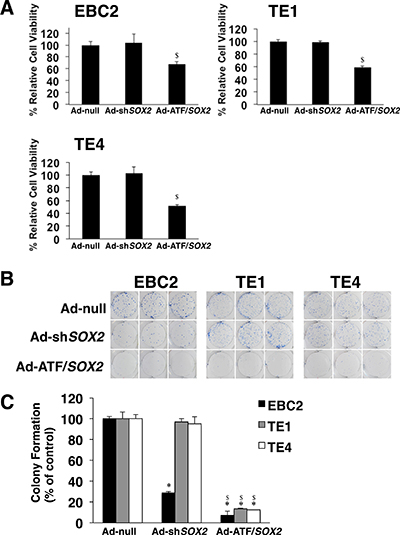 Inhibition of SOX2 by Ad-ATF/SOX2 suppressed cell viability and colony formation of SOX2-expressing lung and esophageal SCC cells