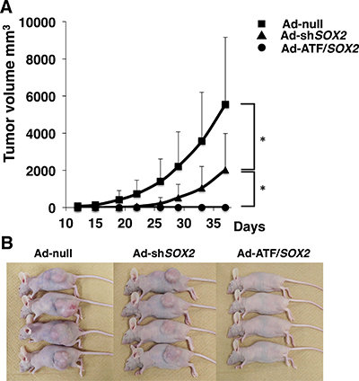Figure 6: Effect of EBC2 xenograft tumor volumes as a function of time and treatment with adenoviral vectors. (A) Volume of the tumors derived from EBC2 lung SCC cells treated with Ad-null, Ad-shSOX2 or Ad-ATF/SOX2 at a MOI of 250 is shown. The volume was monitored over time (days) after inoculation of tumor cells. Fifteen mice were studied in each group. Tumor growth is expressed as mean tumor volume; bars represent SD. Statistical analysis was performed using Student’s t test (two-tailed, unpaired). Statistical significance was defined as *p < 0.01. (B) Macroscopic appearance of EBC2 lung SCC tumors in xenograft mice at 39 days after inoculation.