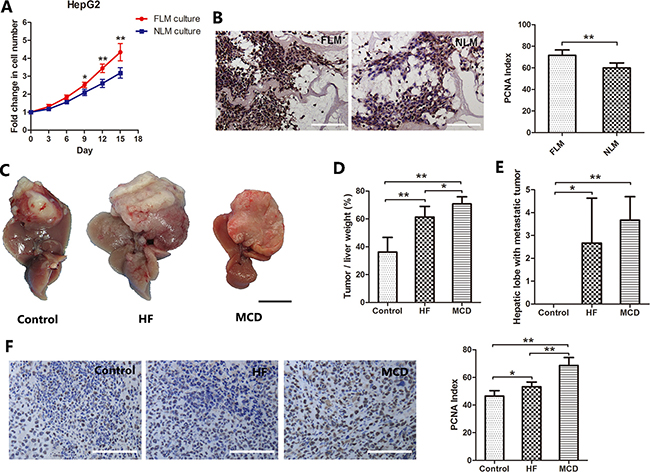 Figure 1: Nonalcoholic fatty liver promotes HCC cells proliferation. (A, B) Cell proliferation profiles of HepG2 cells cultured in human fatty liver matrix (FLM) and human normal liver matrix (NLM). HepG2 cells were seeded into the NLM and FLM and cultured for 15 days. The proliferation of HepG2 cells were measured by residual DNA quantification. (A) HepG2 cells grew faster in FLM than NLM after day 9 (n = 6). (B) PCNA staining and PCNA index of HepG2 cells cultured in the FLM and NLM. (C–F) HCC growth in NAFLD/NASH mice. Mouse models of NFALD/NASH were induced by feeding the mice with either a high fat diet (HF) or a methionine–choline-deficient diet (MCD). Control mice were fed a standard commercial mouse diet (Control). Twelve weeks later, 5 × 106 H22 cells (a mouse liver cancer cell line) were injected into the mouse liver. Two weeks after injecting H22 cells, the mice were sacrificed. The tumor growth in the liver was assessed. (C) Representative macroscopic liver tumor images of each group. (D) The percentage of tumor weight account for liver weight (n = 6). (E) The number of hepatic lobes with metastatic tumor (n = 6). (F) PCNA staining and PCNA index of liver tumor. Scale bar: 100μm (B, F); 1 cm (C), *P < 0.05, **P < 0.001.