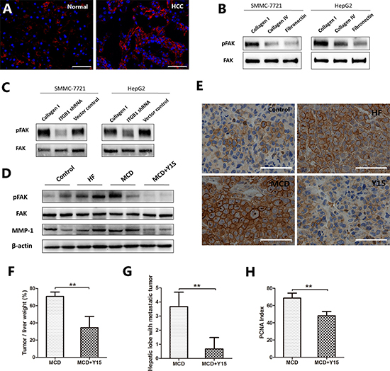 Figure 4: The expression of phospho-FAK in NAFLD-related HCC. (A) Immunofluorescence staining revealed the high expression of phospho-FAK (red) in HCC tissues. (B) Phospho-FAK was higher expressed in the HCC cells cultured on Collagen I compared to Collagen IV and fibronectin. (C) Phospho-FAK was low expressed after integrin β1 knocking down in both cell lines. (D–H) In mouse orthotopic tumor model, a specific inhibitor of FAK, Y15, was used in MCD-fed mice. (D) Western blot indicated that tumors grown in HF- or MCD-fed mice expressed higher levels of phospho-FAK and MMP-1 than those in control diet-fed mice, while Y15 significantly decreased the expression of phospho-FAK and MMP-1 in the tumors of MCD-fed mice. (E) Immunohistochemical staining confirmed the same results. (F) Liver tumor grew smaller after inhibiting the expression of phospho-FAK. (G) Decreased intrahepatic metastasis after inhibiting the expression of phospho-FAK. (H) There was decreased number of PCNA positive cells after inhibiting the expression of phospho-FAK. Scale bar: 50 μm (A, E), *P < 0.05, **P < 0.001.