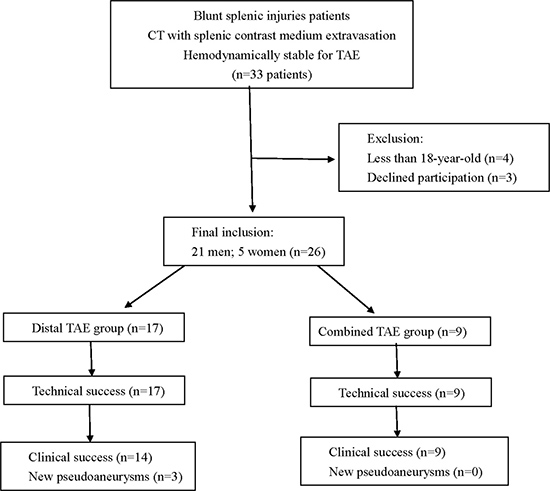 Within a two year study period, a total of 33 patients met the inclusion criteria. They were of blunt splenic injuries with CT findings of contrast medium extravasation and were hemodynamically stable for TAE treatment. We excluded four patients who were less than 18 year-old and three patients who declined to participate in this study (Figure 1). A total of 26 patients (21 men and 5 women) with a mean age of 39.8 ± 18.0 years (range, 18–74 years) were finally included. The mechanisms of injury were motor vehicle accident (n = 22), pedestrian versus car (n = 2) and falling from height (n = 2).