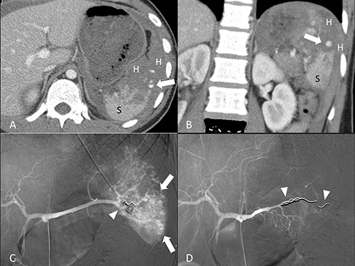 Figure 2: 18-year-old male of grade II splenic injury underwent distal transcatheter arterial embolization. (A, B) Contrast-enhanced axial and coronal CT at portal venous phase shows a pseudoaneurysm (arrow) at the lacerated spleen (S) surrounded by hemoperitoneum (H). (C) Selective angiography confirms the CT finding of a pseudoaneurysm (arrow) and identifies the feeding branch artery (arrowhead). (D) Angiography after a successful distal embolization shows deployment of metallic coils (arrowheads) at the branch artery and obliteration of pseudoaneurysm.