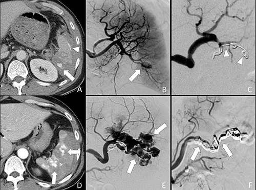 Figure 4: 52-year-old male of grade IV splenic injury underwent combined embolization because of distal embolization failure. (A) Contrast-enhanced axial CT shows a splenic pseudoaneurysm (arrow) and subcapsular contrast medium extravasation (arrowhead). (B) Selective angiography confirms the splenic pseudoaneurysm (arrow). (C) Metallic coils (arrowheads) were deployed at a branch artery of lower pole. Obliteration of the pseudoaneurysm is seen after distal embolization. (D) Arterial phase CT performed one week after embolization shows multiple new pseudoaneuryms (arrows) in the spleen, indicating a distal embolization failure. (E) Repeated angiography of the spleen shows multiple pseudoaneurysms (arrows). (F) Additional metallic coils (arrows) were deployed at the branch and main splenic artery distal to dorsal pancreatic artery for a combined embolization.