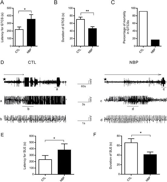 Figure 1: The effect of acute NBP administration (100 mg/kg, i.p.) on the seizures and LFP recordings of rats induced by PTZ (70 mg/kg, i.p.). (A) Latency to generalized tonic-clonic seizures (GTCSs) (CTL, n = 11; NBP, n = 9). (B) Duration of GTCSs (CTL, n = 11; NBP, n = 9). (C) Percentage of mortality rate in PTZ-induced seizures assessed for 60 min (CTL, n = 12; NBP, n = 12). (D) Representative traces of seizure-like events (SLEs) with LFP recordings in rats; (A) (B) (C) and (D) respectively represent the expansions of the tracings of SLEs. The star represents the start of LFP recording, and the arrow represents latency of seizure-like events with GTCSs onset. (E-F) Summary graph of latency (F) and duration (G) of SLEs (CTL, n = 7; NBP, n = 7). The data are presented as the means±SEM. * P < 0.05, ** P < 0.01 compared with the NBP-treated group (paired Student's t-test).