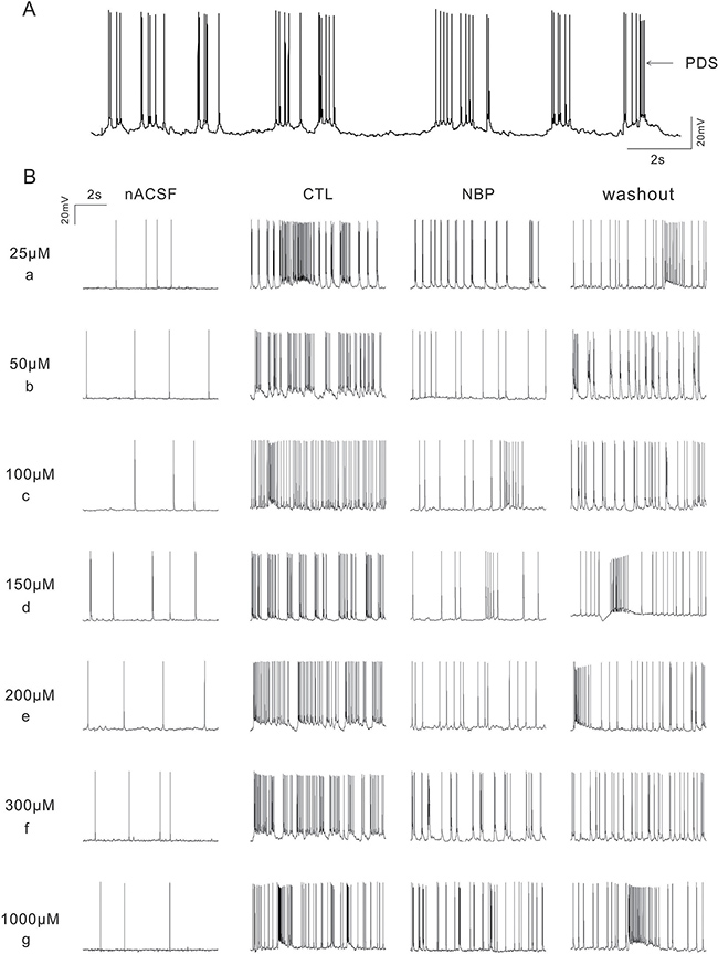 Figure 2: Spontaneous firing frequency and typical PDS of CA1 pyramidal neurons in a 4-AP epilepsy model. (A) Representative typical traces of PDS. (B) Representative traces of spontaneous firing frequency and PDS from normal ACSF (nACSF), Control (CTL) after 10 min perfusion with 4-AP in low-Mg2 ACSF, NBP after 10 min perfusion with 4-AP + NBP in low-Mg2 ACSF, and washout after 15 min washout with 4-AP in low-Mg2 ACSF, where (a) presents activity with 25 μM NBP, (b) presents activity with 50 μM NBP, (c) presents activity with 100 μM NBP, (d) presents activity with 150 μM NBP, (e) presents activity with 200 μM NBP, (f) presents activity with 300 μM NBP, and (g) presents activity with 1000 μM NBP. Note that other concentrations of NBP were recorded (data not shown).