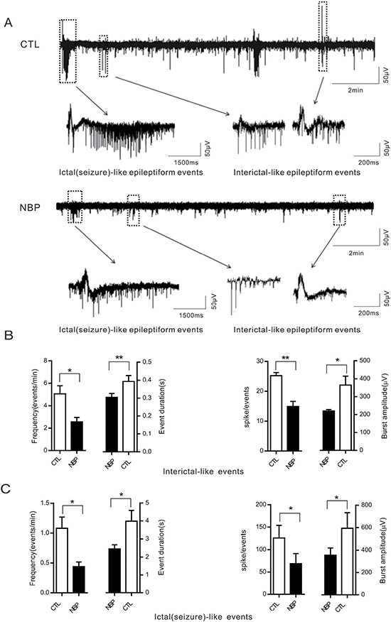 Figure 4: Epileptiform-like activity triggered in acute hippocampal slices significantly decreased by NBP in extracellular recordings. (A) Representative traces of ictal-like and interictal-like epileptiform-like events triggered through the bath application of 4-AP in ACSF (CTL) and after 4-AP + 150 μM NBP. (B-C) Average values of event frequency, duration, spikes and amplitude for interictal-like events (n = 6 slices) (B) and ictal-like events (n = 5 slices) (C). The data are presented as the means ± SEM. Statistical significance (* P < 0.05, ** P < 0.01) was evaluated using paired Student's t-test (bar graph). CTL and NBP are in the same slices.