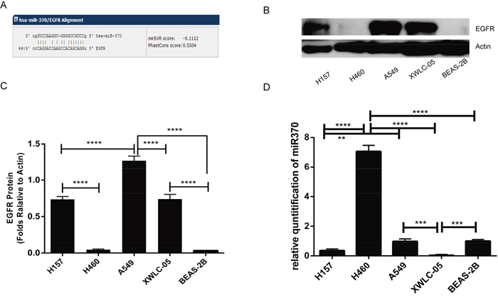 Figure 1: EGFR and miR370 expression in lung cancer cells. (A) A potential binding site of miR-370 in the 3’UTR of the EGFR was predicted using online tools. (B) Western blot analysis of the relative levels of EGFR expression in the indicated cell lines. (C) Quantitative analysis of the levels of EGFR protein expression. (D) Real-time PCR detection of miR-370 transcripts. Data are representative images or expressed as the means ± SEM of each group from three separate experiments. **P<0.01, ***P<0.001, ****P<0.0001.