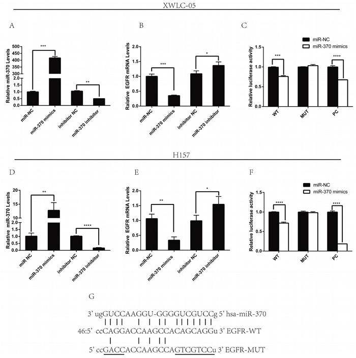 Figure 2: Modulation of miR-370 alters the EGFR expression in lung cancer cells. XWLC-05 and H157 cells were transfected with miR-NC, miR-370 mimics, miR-370 inhibitor NC or miR-370 inhibitor for 24 h. The relative levels of miR-370 and EGFR mRNA transcripts in different groups of cells were determined by quantitative RT-PCR. In addition, XWLC-05 and H157 cells were co-transfected in triplicate with pmiRG-EGFR-UTRwt, pmiRG-EGFR-UTRmut or pmiRG-miR-370-inhibitor-PC, together with 20 nM miR-370 mimics or miR-NC for 48 h and the luciferase activities of individual cell samples were analyzed. Data are representative images or expressed as the means ± SEM of each group of cells from three separate experiments. (A, D) The levels of miR-370 transcripts. (B, E) The relative EGFR mRNA transcripts. (C, F) The luciferase activity. (G) Alignment of the sequences for miR-370 of binding motifs in the wild-type and mutated (underlined) 3’UTRs of EGFR for luciferase assays. *P<0.05, **P<0.01, ***P<0.001, ****P<0.0001.