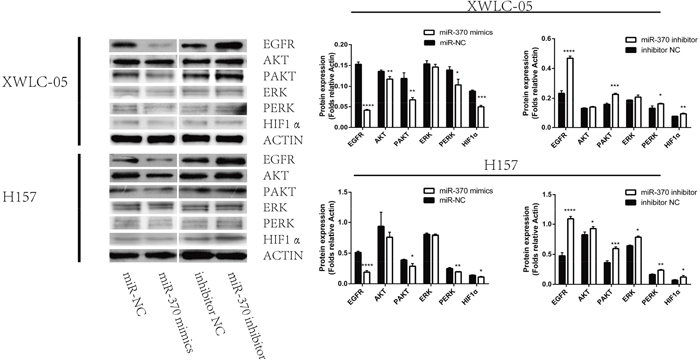 Figure 4: Induction of miR-370 over-expression reduces EGFR and HIF-1α expression and inhibits the ERK and AKT phosphorylation in XWLC-05 and H157 cells. XWLC-05 and H157 cells were transfected with miR-370 mimics, miR-370 inhibitor or corresponding controls for 24 h. The relative levels of EGFR, HIF-1α, ERK, AKT expression, ERK and AKT phosphorylation were determined by Western blot assays. Data are representative images or expressed as the means ± SEM of each group of cells from three separate experiments. *P<0.05, **P<0.01, ***P<0.001, ****P<0.0001.