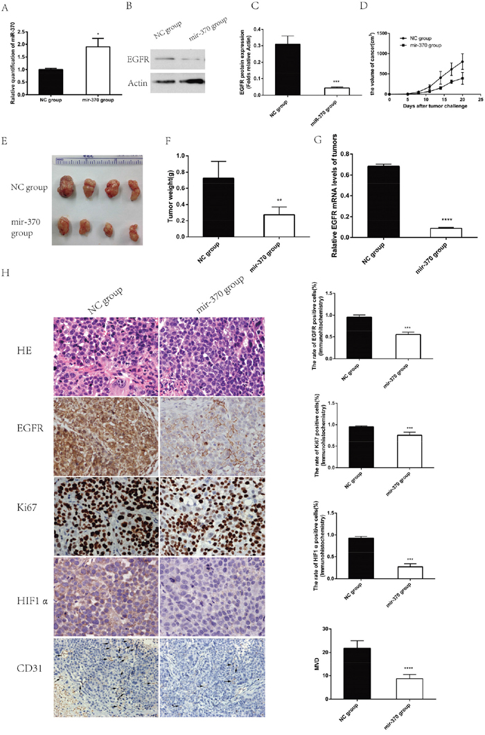 Figure 5: Induction of miR-370 over-expression inhibits the growth and angiogenesis of NSCLC xenograft tumors in vivo. To establish a subcutaneous tumor model in nude mice, XWLC-05 cells were transfected with pre-miR-370 or miR-negative control (miR-NC). The cells were treated with 6 ng/mL blasticidin for 30 days to establish stable miR-370 over-expressing XWLC-05-miR-370 and control XWLC-05-miR-NC cells. The relative levels of miR-370 transcripts and EGFR expression in XWLC-05-miR-370 and control XWLC-05-miR-NC cells were determined by quantitative RT-PCR and Western blot assays, respectively. Individual female BALB/c nude mice were implanted subcutaneously with 2×106 XWLC-05-miR-370 or XWLC-05-miR-NC cells (n=4, per group). The growth of formed solid tumors in individual mice were measured longitudinally up to 20 days post implantation. Their tumors were dissected, imaged and weighed. The relative levels of EGFR expression in individual rumor tissues were determined by quantitative RT-PCR. The tumor tissue sections were stained by H&E and the percentages of EGFR+ or Ki67+ tumor cells were determined by immunohistochemistry. In addition, the levels of HIF-1α and CD31 expression in the tumor sections were also examined by immunohistochemistry and the levels of MVD was determined. Data are representative images (magnification x 400 or 200) or expressed as the means ± SEM of each group. (A) The levels of miR-370 transcripts in the stable transfected cells. (B) Western blot analysis of EGFR protein expression in the stable transfected cells. (C) The levels of EGFR protein expression in the stable transfected cells. (D) The dynamic growth of implanted tumors in mice. (E) The dissected tumors. (F) The tumor weights. (G) The levels of EGFR mRNA transcripts in each group of tumors. (H) Histological and immunohistochemistry analysis. *P<0.05, **P<0.01, ***P<0.001, ****P<0.0001.