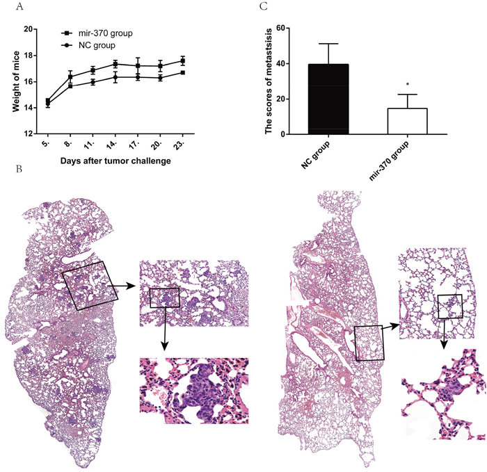 The impact of miR-370 on the metastasis of implanted tumors was determined. Briefly, individual mice were injected intravenously with 1×106 XWLC-05-miR-370 or XWLC-05-miR-NC cells (4 mice per group). Their body weights were measured every 3 days beginning on day 4 up to 24 days post injection. The mice were sacrificed and their lungs were dissected. The dissected lung tissues from individual mice were fixed in 10% buffered formalin and paraffin-embedded. The lung tissue sections (4 μm) were stained with hematoxylin and eosin, and photoimaged under a light microscope (Leica DM4000B, Solms, Germany). The images were evaluated by a pathologist (at Department of Pathology, the Third Hospital Affiliated Kunming Medical University) in a blinded manner. The pulmonary micrometastases were scored, according to the size (S) of the majority of lesions as: 1, small lesions containing approximately 25-100 tumor cells; 2, medium-sized lesions containing approximately 100-500 tumor cells; 3, large lesions containing more than 500 tumor cells [32]. The lung involvement was also scored for the surface area (A) interested by lesions: 1, < 5% of the lung surface involved; 2, between 5% and 50% of the lung surface involved; 3, >50% of the lung surface involved. A metastatic score was obtained by multiplying these two partial scores as size × involved area (S × A).