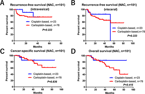 We retrospectively evaluated the tumor response, post-therapy pathological downstaging (cT–pT stage), and LVI between the Ctrl and NAC groups. Intravesical RFS, visceral RFS, CSS, and OS were evaluated using the Kaplan–Meier methods with a log-rank test between the two groups. Multivariate Cox regression analysis was performed for independent factors for RFS, CSS and OS. Additionally, we analyzed the impact of regimen for the NAC group on oncological outcomes between the GCis and GCarbo groups.