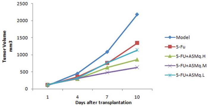 As shown in Figure 2, after treatment with ASMq and 5-FU, the average tumor volume was less than in the 5-FU group, and the difference was statistically significant (P<0.05).