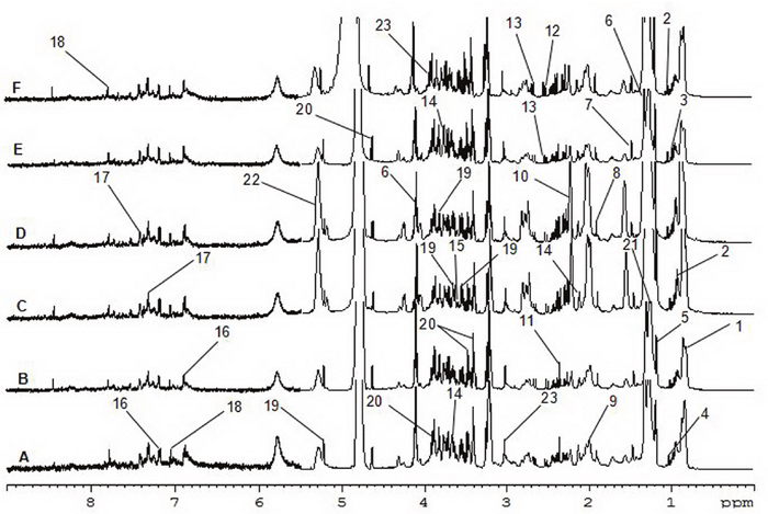 Figure 3: 600 MHz 1H-NMR Spectra of serum. (A) control group; (B) model group; (C) 5-FU group; (D) ASMq.L group; (E) ASMq.M group; (F) ASMq.H group.
