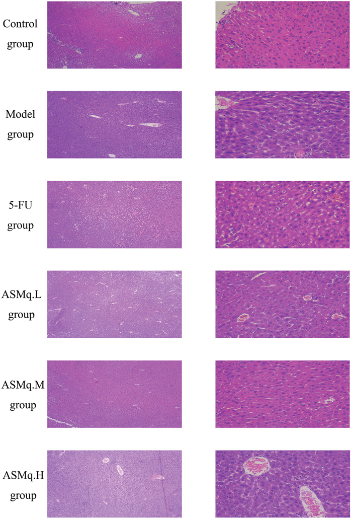 Pathological changes in the livers of all experimental groups were analyzed by HE staining. The histological sections shown in Figure 5 make it clear that the livers in the control group possessed a normal structure, without any lesions. The typical hepatic lobule structure was still present, the morphology of the hepatocytes was normal, the hepatic cords were radially arranged, and a minimal amount of blood was observed in the vein. The livers from the model group showed a normal structure without any lesion, and the hepatic cords were radially arranged. For mice in the 5-FU group, the spindle structure of the hepatocytes was still present, but swollen hepatocytes and a small number of infiltrated inflammatory cells were observed near the veins; furthermore, dilation of the central veins was reduced compared with the model group, but serious congestion was still present. In the livers from the ASMq.M group, the spindle structure of the hepatocytes was lost, no dilation of the central veins was observed, and slight congestion in the central veins and hepatic sinusoids was detected. Occasional swollen hepatocytes were also noted in this group. In the livers from the ASMq.H group, the spindle structure of the hepatocytes was barely detectable, and prominent dilation and moderate congestion were observed in the central veins. Slight congestion appeared in the hepatic sinusoids and swollen hepatocytes.
