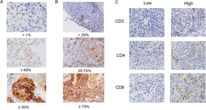 The anti-PD-L1 antibody MPDL3280A has been reported to elicit improved clinical responses in patients with tumors that express high levels of PD-L1 and contain higher numbers of tumor-infiltrating immune cells [39]. Similarly, it has been suggested that patients with tumor cells expressing PD-L1, as well as a high density of CD8+ TILs may achieve better outcomes via an anti-PD-1 blocking antibody [38]. Further studies are required to determine the predictive relevance of a co-assessment of PD-L1 expression and CD8+ TIL density for selecting patients with HPSCC who are most likely to respond to the PD-1/PD-L1 blocking treatments.