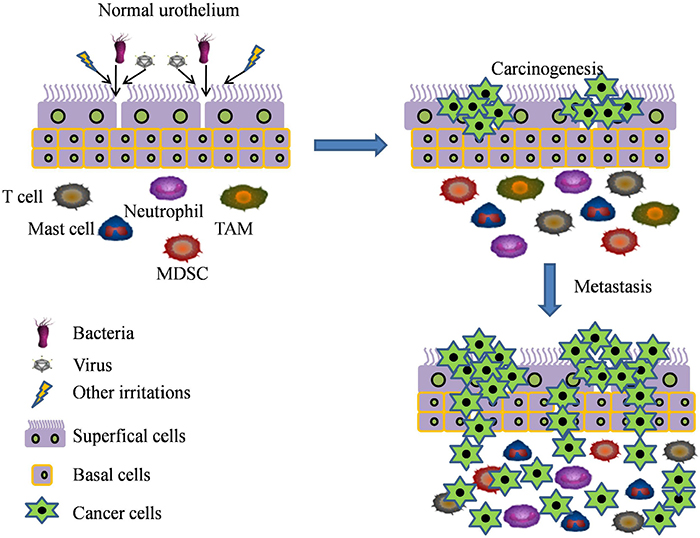 Figure 1: The inflammatory spectrum underlying the carcinogenesis and progression of bladder cancer. Many factors such as infections (bacterial, S. haematobium, viral), proinflammatory cells (such as TAM, MDSC, T cells, mast cells and neutrophils), and chronic chemical or mechanical irritation are considered as a major risk factors of chronic inflammation. These factors can activate the inflammatory responses which contribute to the formation and development of bladder cancer.