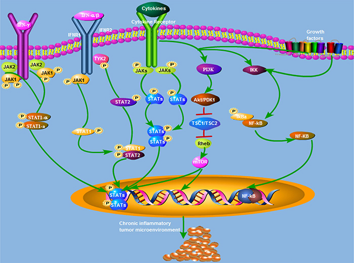 JAK-STAT3 is a crucial signal pathway for the pathogenesis and progression of various inflammatory diseases including cancer. JAKs are key participants in signaling networks fueled by a variety of cytokine and growth factor receptors in the tumor microenvironment, including IL-6, IL-11, IL-27, interferon (IFN-α/β/γ) oncostatin M (OSM), leukemia inhibitory factor (LIF), epidermal growth factor (EGF) and others [112]. There are four JAK family members in mammalian cells, JAK1, JAK2, JAK3, and TYK2. JAKs mediate intracellular signaling cascades principally through creating STAT docking sites via phosphorylation of tyrosine residue [113]. Once tyrosine is phosphorylated, STAT proteins are rapidly transported from the cytoplasm to the nucleus and bind to DNA elements to elicit transcriptional outputs in a specific cell or tissue [114]. STAT3 is a member of STAT family and its phosphorylation at Tyr705 or Ser727 is widely mediated in a variety of cellular contexts, especially JAK2 [115].