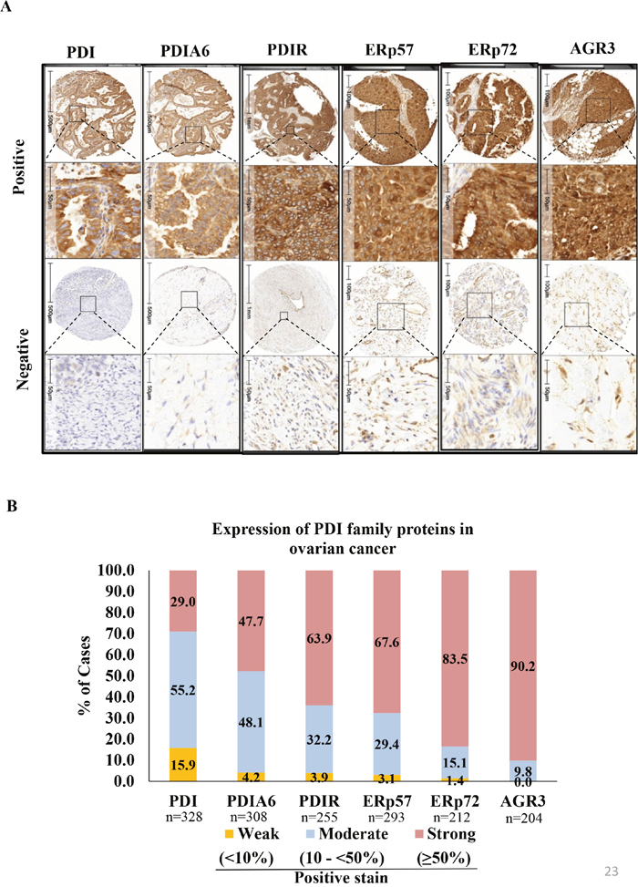 Figure 2: Immunohistochemical expression patterns of PDIs in ovarian cancer tissue samples. (A) Representative examples of positive and negative/weakly positive staining pattern of PDI, PDI family protein in ovarian cancer tissues (B) PDI family protein expression in ovarian cancers. % of staining automatically quantified by HALO (Indica labs informed pathology). % of cases of strong, moderate and weak expression for each protein was plotted in stacked columns in Microsoft Excel.