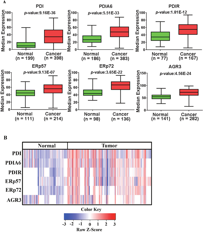 The majority of EOC patient samples had strong expression of PDI proteins except for PDI and PDIA6 (29.0% and 47.7% strong expression respectively). Next, we compared the expression in cancerous tissues to that in normal tissues (normal tissue refers to non-tumor control; see Materials and Methods Section). PDI proteins are highly expressed in EOC compared to normal tissues (Figure 3A, p = 9.16E-36 for PDI, p = 5.51E-33 for PDIA6, p = 1.81E-12 for PDIR, p = 9.13E-07 for ERp57, p = 3.65E-22 for ERp72, p = 4.56E-24 for AGR3). Expression patterns of PDI proteins are displayed in a heatmap in Figure 3B and expression patterns in fold change are presented in Supplementary Figure 5. It has been reported that upregulation of PDIs occurs at the mRNA and protein level in many cancers [27, 29]. Similarly, we observed upregulation of PDIs at the mRNA level (Supplementary Figure 6) as well as at the protein level in ovarian cancer.