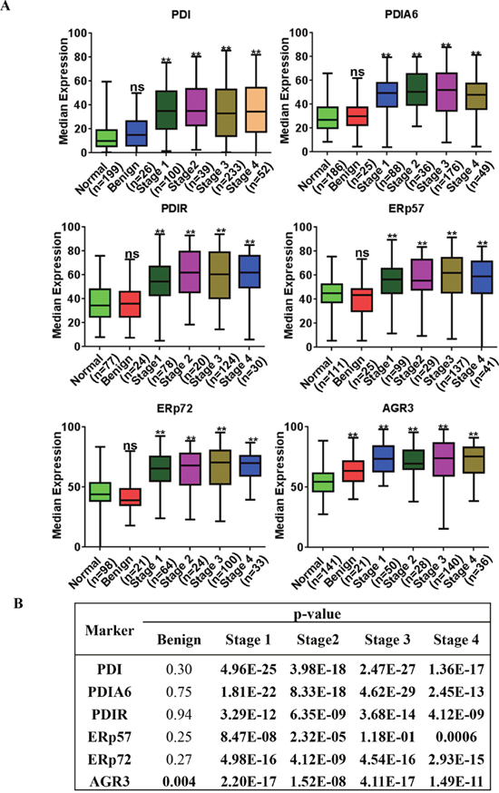 We further investigated whether there is a correlation between expression of PDI proteins and clinico-pathological status (Figure 4). Expression of PDI, PDIA6, PDIR, ERp57, ERP72 and AGR3 is significantly correlated with patients’ tumor stages (stage I, stage II, stage III, stage IV, p = <0.001). Benign tumor expression patterns were not significantly different than those in normal tissues, except for AGR3, which showed significantly increased expression in benign tumors compared to normal tissue (p = <0.005, Figure 4B)
