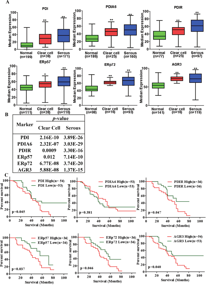 Figure 5: PDI family proteins (PDIs) overexpressed in serous ovarian cancer and expression levels significantly associated with poor overall survival of ovarian cancer. (A) Expression of PDIs in clear cell ovarian carcinoma and serous ovarian carcinoma. *p-value<0.05, **p-value<0.005 (B) p-values for expression compared to the normal, bolds values are statistically significant. (C) PDIs expression associated with overall survival rate of the all types of ovarian cancer patients. Data sets were obtained from UM population and analyzed with Prism 6 (GraphPad Software, Inc.). The Kaplan-Meier survival analysis method was used to generate survival curve based on OS data using low (