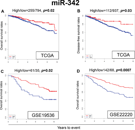 Figure 1: Expression levels of miR-342 and survival. Kaplan-Meier estimates of survival among TCGA and GEO cohorts of breast cancer patients based on high and low expression of miR-342. (A) Overall survival (OS) in TCGA. (B) Disease-free survival (DFS) in TCGA. (C) OS in GSE19536. (D) OS in GSE22220. High and low expressions are represented by the red and blue lines, respectively. Bold font indicates significant difference. Not significant (N.S.).