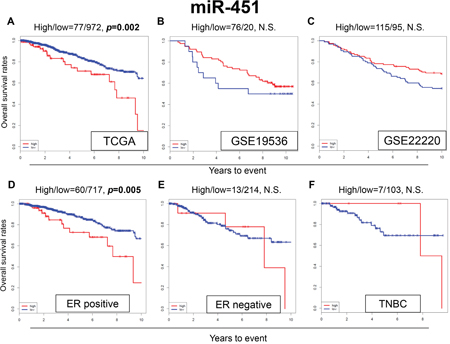 Figure 3: Expression levels of miR-451 and survival. Kaplan-Meier estimates of survival among TCGA and GEO cohorts of breast cancer patients based on high and low expressions of miR-342. (A) OS in TCGA; (B) OS in GSE19536; (C) OS in GSE22220. Expression levels of miR-451 and survival in (D) ER-positive, (E) ER-negative and (F) TNBC breast cancer patients in TCGA. High and low expressions are represented by the red and blue lines, respectively. Bold font indicates significant difference. Not significant (N.S.).