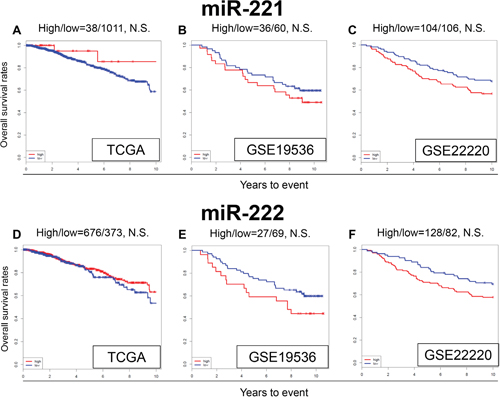 Figure 4: Expression levels of miR-221 and miR-222 and survival. Kaplan-Meier estimates of survival among TCGA and GEO cohorts of breast cancer patients based on high and low expression of miR-221 and miR-222. OS for (A) miR-221, and (D) miR-222 in TCGA; OS for (B) miR-221 and (E) miR-222 in GSE19536; (C) OS for miR-221 (F) and miR-222 in GSE22220. High and low expressions are represented by the red and blue lines, respectively. Bold font indicates significant difference. Not significant (N.S.).