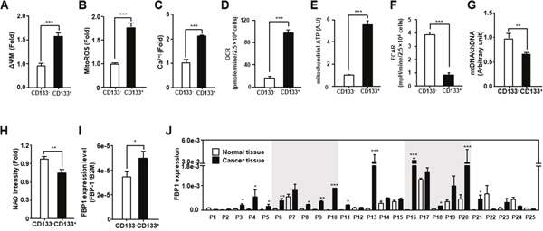 Figure 1: Comparison of mitochondrial function in endometrial CSCs (CD133+) and non-CSCs (CD133−). (A-F) Mitochondrial membrane potential (A), mitochondrial ROS levels (B), calcium levels (C), OCR (D), mitochondrial ATP levels (E), and ECAR (means relative to lactic acid production (F) measured in CD133+ and CD133− sorted cells from the Ishikawa endometrial cancer cell line. ECAR, extracellular acidification rate. Mitochondrial ATP levels are measured by quantifying the luciferase-catalyzed, ATP-dependent oxidation of luciferin in endometrial CSCs and non-CSCs. (G) Mitochondrial DNA content calculated from the ratio of mitochondrial DNA to chromosomal DNA, measured by qPCR using primers specific to the mitochondrial D-loop, and chromosomal β2-microglobulin (B2M) gene. (H) Mitochondrial content measured by fluorescence-activated analysis in CD133+ and CD133− cells stained with nonyl acridine orange (NAO) dye. (I) qRT-PCR analysis of FBP1 levels, which are related to glycolysis and gluconeogenesis, in CD133+ and CD133− cells isolated from Ishikawa cells. (J) Transcript levels for FBP1 in 25 pairs of tissues from human patients with EC, measured by qRT-PCR. FBP1 levels are calculated using standard methods, after normalizing against the B2M level in each sample.