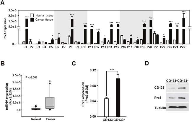 Figure 2: Mitochondrial Prx3 is upregulated in CD133+ cells and human EC tissues. (A and B) Transcript levels for Prx3 in 25 pairs of tissues from human patients with EC, measured by qRT-PCR (A). The box plot analysis shows the median and 25th and 95th percentiles, based on the results from Figure 2A (B). (C and D) Prx3 expression, measured using a qRT-PCR (C) and western blotting (D) in the CD133+ and CD133− subpopulations, isolated from Ishikawa cells.